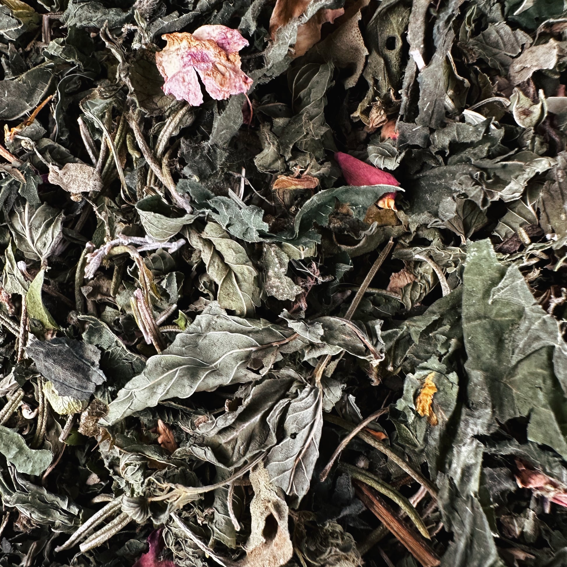 Zutaten: Rosmarinblatt, Pfefferminzblatt, Basilikumblatt mit Zitronenduft, Spitze des Weißdornblütensprosses