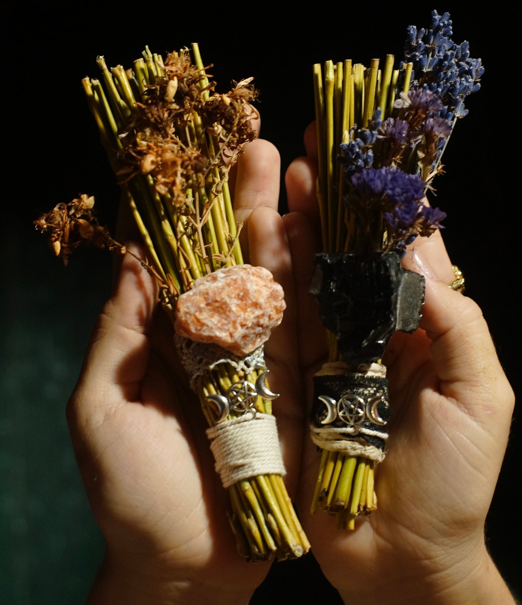 Ez a kézzel készült, egyedi oltárdísz a sötét évszakba való belépést kíséri. Alapját természetes fűzfaágak adják (mágia és tisztulás fája), melyeket erőteljes védelmező és tisztító energiákkal töltöttünk meg. A fekete obszidián kristály mély, árnyékbeli munkához és energetikai védelemhez kapcsolódik, míg a levendula és sóvirág a békét, tisztaságot és spirituális nyitottságot hozza el az otthonodba.